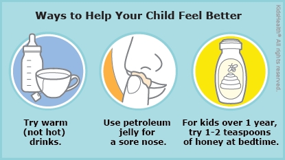 Children with a cold may have a runny or stuffy nose, sneezing, a cough, a sore throat, and a low fever. Colds are caused by viruses (types of germs). They clear up on their own within about 2 weeks. Antibiotics don't work against viruses, so they can't treat colds.