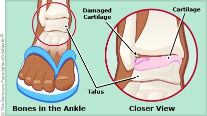Osteochondritis dissecans (OCD) of the ankle starts when a spot on the outer layer of the talus (one of the bones of the ankle) becomes compressed or damaged, usually from an injury. The damaged bone tissue and attached cartilage begin to separate from the rest of the talus. This area of damaged tissue is called an OCD lesion. If the lesion is not treated, arthritis may develop in the joint.