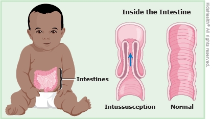 Intussusception happens when part of the bowel slides into another part of the bowel like the parts of a telescope. This causes a blockage that leads to belly pain and can block blood flow to the bowel. It needs quick treatment, or the bowel can be damaged. The doctor used a kind of enema to treat the intussusception (in-tuh-suh-SEP-shun). A small tube was placed in your child's bottom and taped in place. The doctor then filled the bowel with air or liquid and pushed the "telescoped bowel" back into place, which fixed the intussusception.