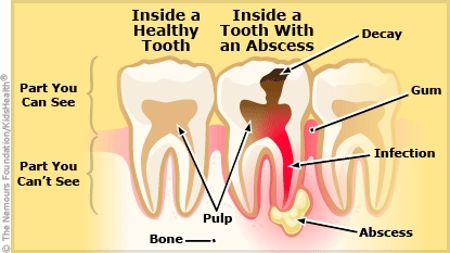 A dental abscess, or tooth abscess, is an infection that leads to a buildup of pus inside of a tooth. It happens when bacteria (a type of germ) gets into the tooth through a cavity or broken tooth. Without treatment, the infection can lead to loss of the tooth or spread to other areas.
