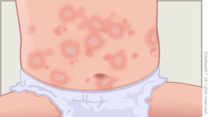 Erythema multiforme (air-uh-THEE-muh mul-ti-FOR-mee) is a reaction of the body's immune system to an infection, medicine, or another health problem. Red blotches on the skin develop into spots that look like a target or a "bull's-eye." Some of the spots have blisters in the center. They tend to appear first on the arms, hands, legs, and feet, and then can develop on any part of the body. Some children get blisters on the lips and inside the mouth.