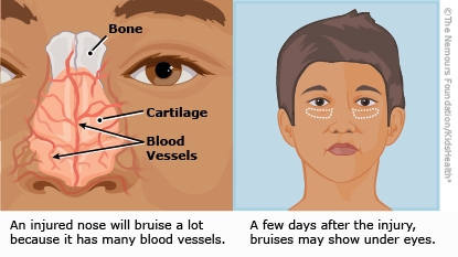 A nasal contusion means a bruised nose. When the nose gets hit, blood vessels are injured and blood can leak out under the skin, causing the tender, purplish mark known as a bruise. Injuries to the nose can cause a lot of swelling and look serious, but usually don't cause lasting problems. You can help comfort your child while the bruise heals.