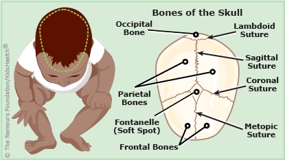 At birth, babies have fibrous joints called sutures that hold the skull bones together. The sutures can squeeze together during childbirth but also can get bigger to give the brain room to grow. Over the next 20 years or so, the sutures close, forming the hard bones of the skull.