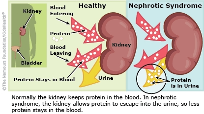Nephrotic syndrome happens when the kidneys can't filter blood normally. Too much protein from the blood leaks into the urine (pee), causing low protein levels in the blood (hypoalbuminemia). Without enough protein in the blood, water moves from the blood into other parts of the body. This leads to swelling (edema) in the eyes, ankles, feet, belly, and other parts of the body. Kids with nephrotic (neh-FROT-ik) syndrome can have other problems too.