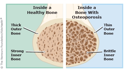 People with osteoporosis (os-tee-oh-puh-ROH-sis) have weak bones that can break easily. Because kids' bones are still growing and developing, treatment usually can help them get strong again. Treatment may include medicines, supplements (like calcium and vitamin D), physical therapy and exercise, and meeting with a nutritionist.