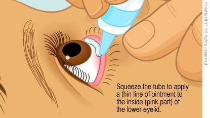- Squeeze the tube to apply a thin line of ointment to the inside (pink part) of the lower eyelid. Start near the nose and move out toward the ear. Usually, a ½-inch (1-centimeter) line of ointment is enough.