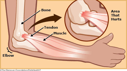 Lateral epicondylitis is an injury to one or more of the tendons in the elbow. Tendons are rope-like bands of tissue that connect muscles to bones. Kids who do activities involving repeated arm movements sometimes get swelling or small tears in the tendons that connect the elbow to the forearm and wrist. They may have elbow and forearm pain, as well as wrist weakness.