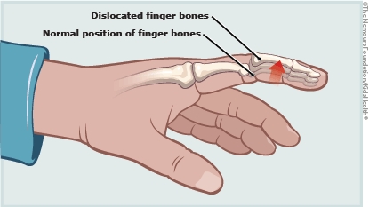 A dislocated finger happens when the bones of a finger slip out of place. It's treated by placing the finger in a splint or taping the injured finger to the neighboring finger ("buddy taping") with padding in between. Buddy taping usually is needed for a few days to a few weeks while the injury heals. Most kids who dislocate a finger can gradually return to their normal activities. The finger may feel stiff for a while.