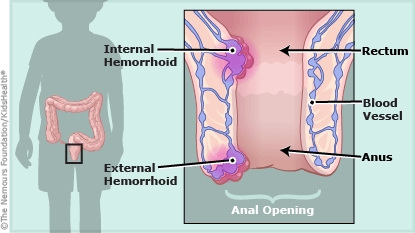 Hemorrhoids are swollen veins in the rectum (internal hemorrhoids) or anus (external hemorrhoids). In kids, most hemorrhoids are external and caused by constipation. Constipation is when kids don't have a bowel movement (poop) as often as usual or have a tough time going because the poop is hard and dry. Having diarrhea, sitting on the toilet too long, or straining to poop also can cause hemorrhoids.