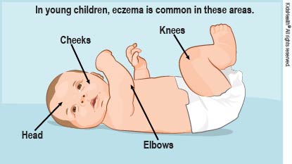 Babies and children with eczema (also called atopic dermatitis) have dry, flaky, itchy skin. In children with light skin, eczema (EG-zeh-muh) areas look red or pink. In children with dark skin, they might look brown, purple, or gray. Changing your child's skin care routine and avoiding things that make eczema worse can help control it.