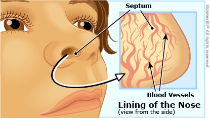 What causes nosebleeds? While nosebleeds can happen from a blow to the nose, in kids many happen because they pick at crusty nasal membranes that are dried out from dry climates or heated indoor air. This can break the tiny, fragile blood vessels in the septum (the wall that divides the nose into two halves), causing blood to come out of the nostril. Nosebleeds also can happen if nasal membranes get irritated from common colds or allergies.