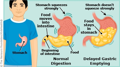 In normal digestion, the stomach muscles contract (squeeze) to break food down and move it into the small intestine. The stomach usually moves about 90% of eaten food into the small intestine within 4 hours. In kids with delayed gastric emptying or gastroparesis, the stomach muscles don't contract strongly and food stays in the stomach longer. A child may feel full after eating only a little bit of food; lose weight; or have bloating, nausea, or vomiting.