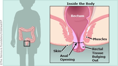 Rectal prolapse can have different causes. In babies and kids, it's most often due to constipation (infrequent, hard poops) or diarrhea. When the cause isn't clear, health care providers might do tests or recommend that a child see a medical specialist.