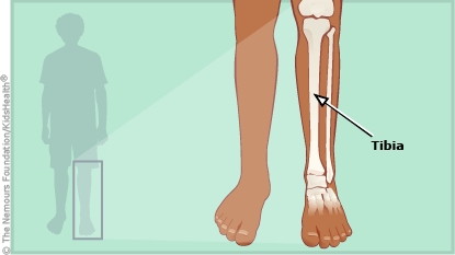 The tibia (also called the shinbone) is the larger of the two bones in the lower leg between the knee and the ankle. Your child has a splint to treat a fracture (break) in the bone. A splint is like a cast but doesn't go all the way around the leg. A splint helps fractures by holding the bones in place while they heal. In a few days after the swelling goes down the splint will be changed to a cast.