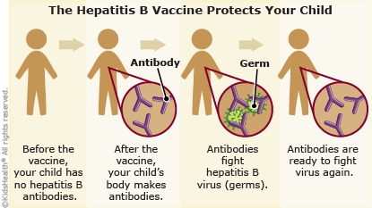 The hepatitis B vaccine is made from broken-down hepatitis germs. After a child gets the vaccine, their body makes antibodies (germ-fighting proteins) against the germs. If they have contact with HBV, the antibodies fight the virus and help get rid of it before the child feels sick or the virus causes any problems. This protection usually lasts into adulthood.