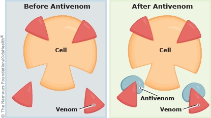 Your child was treated in the hospital for a venomous snake bite. The wound was cleaned well and your child may have been given IV (intravenous or into a vein) antivenom. Antivenom prevents the venom from attaching to cells and harming the body.