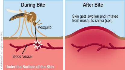 Why do mosquito bites itch? A mosquito's saliva (spit) makes a bite itch. When a mosquito bites a person, some of its saliva goes under the skin. Sometimes, the saliva has germs that can cause infection or illness.