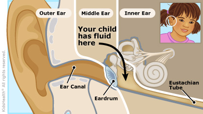 Kids can get fluid in the middle ear (called a middle ear effusion) after an ear infection or when the tube that drains fluid from the middle ear to the throat (the eustachian tube) is blocked.