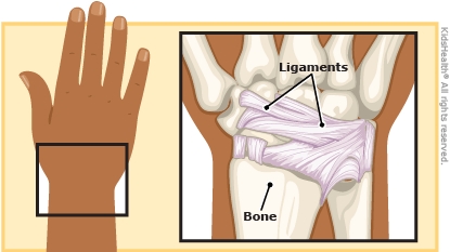 A sprain happens when a ligament stretches or tears. Ligaments are stretchy bands that connect bones to each other. A wrist sprain usually happens when the wrist twists or bends too far, usually from falling on an outstretched hand.
