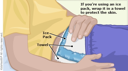 - Place a cold pack wrapped in a towel on the area for 15–20 minutes a few times a day for the first few days after an injury. Put a towel or cloth between the cold pack and the skin.