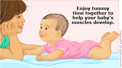 To help your baby's muscles get stronger, put your baby on their belly for "tummy time." Do this 2–3 times a day for 3–5 minutes when your baby is awake. Build up to more tummy time as long as your baby doesn't get frustrated. Be sure an adult stays with your baby during tummy time.