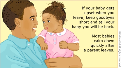 Your baby may start to get upset when you leave. To help your baby understand that you will be back, keep goodbyes short and calm and tell your baby you will be back. Your baby may be upset at first, but will likely calm down after you leave.
