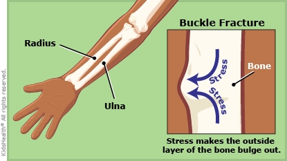 Why do kids get buckle fractures? Kids' bones are still growing and not as hard as adults' bones. If they hold out their arms to stop a fall, the pressure on the bone makes the outside layer of bone bulge out.