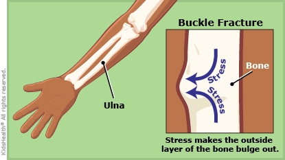 Why do kids get buckle fractures? Kids' bones are still growing and not as hard as adults' bones. If they hold out their arms to stop a fall, the pressure on the bone makes the outside layer of bone bulge out.