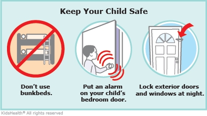 - Consider putting a safety gate across your child's bedroom door or installing an alarm that goes off when your child opens the door.