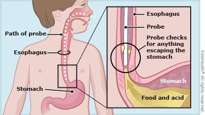 The health care provider slid the probe (a thin tube with sensors) through your child's nose and into the esophagus (the passageway that takes food from the throat to the stomach). Some of the sensors track if anything comes back out of the stomach into the esophagus and how often that happens. Other sensors track the acid level (pH) of the stomach liquid. The probe is usually kept in place for 24 hours to take measurements while your child does normal activities like eat, drink, and sleep.