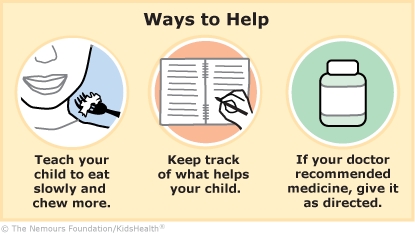 - Offer small, more frequent meals instead of fewer large meals. Remind your child to eat slowly and chew food thoroughly.