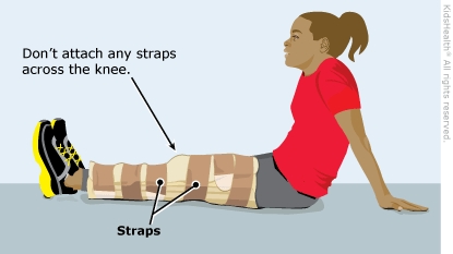 A knee immobilizer is a brace that wraps around the leg to keep the knee straight. It is made of fabric, padding, and straps that hold it in place. Long pieces of metal on the sides keep the brace straight. Using the brace correctly will make your child more comfortable and help healing.