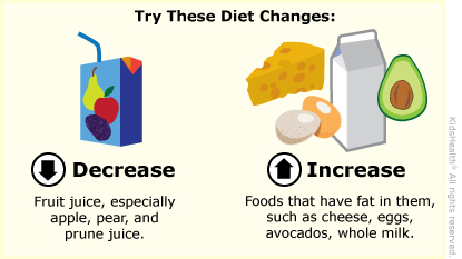 It also may happen when toddlers drink too much fruit juice, sports drinks, and other sweetened drinks. Sometimes it begins after a child has an infection. For some kids, a low-fat or low-fiber diet may be the cause.