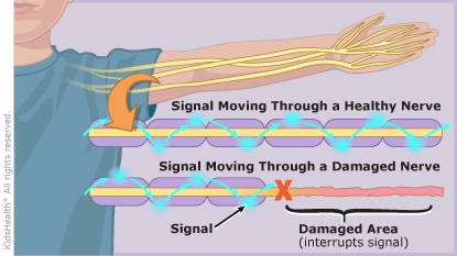 What happens in Guillain-Barré syndrome? In Guillain-Barré syndrome the body's immune system attacks nerves outside the brain and spinal cord. This causes temporary weakness or paralysis (not being able to move certain parts of the body). Kids and teens with Guillain-Barré syndrome have mild to severe muscle weakness and muscle pain. It also can cause tingling, numbness, or "pins and needles" feelings in the arms, legs, and upper body.