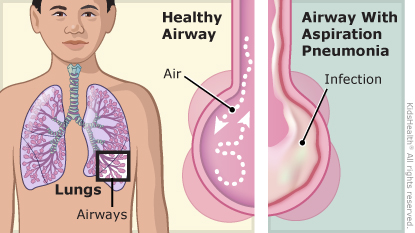 Aspiration pneumonia is a lung infection. It happens when something gets into the lungs that doesn't belong there. Kids with aspiration pneumonia may have a fever, cough, chest pain, and trouble breathing.