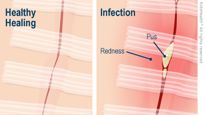 How will I know if my child's incision is infected? An infected incision will get red and swollen, seem sore, and/or have discharge (pus) coming through the stiches, staples, or wires. An infection also can cause a fever and make a child seem fussier than usual. Call your surgeon if your child has any of these signs.