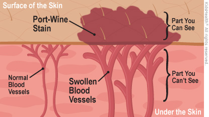 A port-wine stain is a birthmark made of swollen blood vessels under the skin. Some are small and light pink and others are large and darker. A port-wine stain doesn't go away on its own, but if someone wants to lighten it, treatments can help it fade.