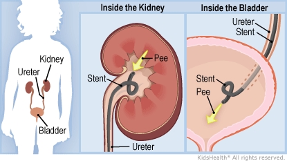 A ureteral (yuh-REE-teh-rel) stent is a small, hollow tube placed inside the ureter (the tube that leads from the kidney to the bladder). The stent helps urine (pee) pass from the kidney into the bladder (where pee is stored before it leaves the body).