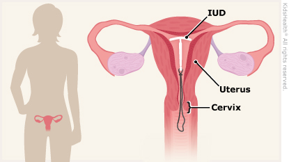 A hormonal IUD (intrauterine device) is a piece of T-shaped plastic, about the size of a quarter, that is placed inside the uterus. The IUD can make periods lighter, come less often, or not come at all. It also prevents pregnancy and can stay in place for many years.