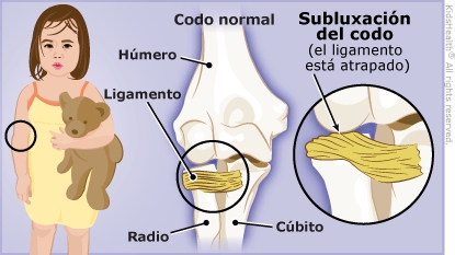 ¿Por qué los niños sufren de subluxación del codo? Los ligamentos de los niños pequeños son un poco laxos (flojos). A veces, al jugar o cuando al niño se lo levanta de los brazos, los dos huesos del codo se pueden separar un poco brevemente y permitir que el ligamento se meta en la articulación y quede atrapado. A medida que los niños crecen, los ligamentos se fortalecen. La mayoría de los niños no se hacen subluxaciones del codo a partir de los 5 años de edad, aunque es posible que ocurran hasta los 6 o 7 años.
