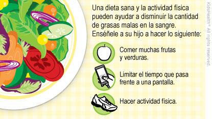 Los análisis de sangre muestran que su hijo tiene dislipidemia, una afección donde existen demasiadas grasas dañinas (malas) y pocas grasas beneficiosas (buenas) en la sangre. Alimentarse con una dieta sana y hacer ejercicio físico de manera regular pueden mantener un mejor equilibrio de estas grasas. Esto ayuda a prevenir afecciones del corazón en el futuro.
