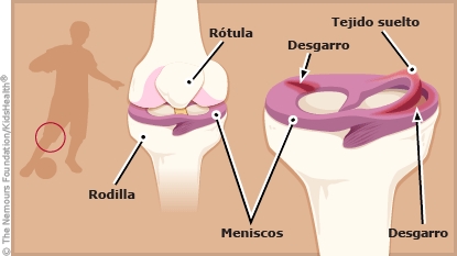 ¿Cómo ocurre el desgarro de meniscos en niños y adolescentes? En niños y adolescentes, el desgarro de menisco suele ocurrir cuando se tuerce o gira la rodilla mientras se pone el peso sobre ella; por ejemplo, al aterrizar después de un salto o cuando se realiza un cambio brusco de dirección. También puede ocurrir cuando alguien se cae o se golpea la rodilla. Los desgarros de meniscos a menudo aparecen junto con otras lesiones de la rodilla, como cuando se rompe un ligamento (bandas gruesas de tejido que ayudan a mantener las articulaciones juntas).