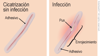 ¿Qué ocurre cuando un corte que se unió con adhesivo para la piel cicatriza? El adhesivo para la piel mantiene unidos los bordes de un corte mientras cicatriza y ayuda a proteger el corte de las infecciones. Es normal que haya un enrojecimiento leve o picazón en la zona del corte. Después de 7 a 10 días, el corte debería haber cicatrizado y el adhesivo se caerá solo.