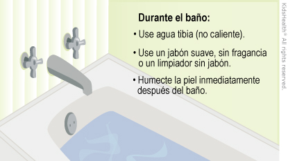 Los niños con eccema (también llamado "dermatitis atópica") tienen la piel seca, escamosa y con picazón. En niños con piel clara, las áreas de eccema se ven rojas o rosadas. En niños con piel oscura, las áreas de eccema se ven marrones, moradas o grises. Cambiar la rutina de cuidado de la piel de su hijo y evitar cosas que empeoran el eccema puede ayudar.