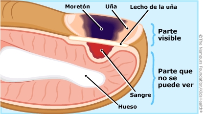 Un hematoma subungueal es una acumulación de sangre que queda atrapada debajo de una uña. Con frecuencia se debe a una lesión, como el aplastamiento de un dedo por un pisotón o con una puerta. La zona lesionada sangra debajo de la uña y, como resultado, se pone de color negro azulado. Los niños con un hematoma subungueal tal vez sientan un dolor punzante debajo de la uña, que suele empeorar a medida que la sangre se extiende.