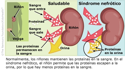 El síndrome nefrótico ocurre cuando los riñones no logran filtrar la sangre correctamente. Una cantidad excesiva de proteínas de la sangre pasa a la orina (pis) y causa un bajo nivel de proteínas en la sangre (hipoalbuminemia). Sin suficientes proteínas en la sangre, el agua pasa de la sangre a otras partes del cuerpo. Esto causa una inflamación (edema) en los ojos, los tobillos, el abdomen y otras partes del cuerpo. Los niños con síndrome nefrótico también pueden tener otros problemas.