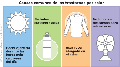 Los trastornos causados por el calor ocurren cuando aparecen problemas porque el cuerpo no puede enfriarse. Los tres tipos principales de trastornos causados por el calor son los calambres por calor, el agotamiento por calor y el golpe de calor. El golpe de calor es una emergencia médica. Sin tratamiento, puede provocar la muerte. A continuación, se incluyen algunas formas de proteger a los niños de los trastornos causados por el calor.