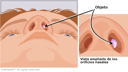 ¿Puede ser peligroso un objeto en la nariz? Sí. Algunos objetos pueden ser peligrosos. Por ejemplo, las pilas de botón (pilas redondas y planas que se usan en relojes, juguetes, controles remoto y otros dispositivos) pueden provocar quemaduras en el interior de la nariz. Además, si se colocan imanes en la nariz, estos pueden atraerse entre sí. Al hacerlo, pellizcan y provocan daños en la parte de la nariz que se encuentra entre ambas fosas nasales (el tabique). Además, un objeto atorado dentro de la nariz puede ser aspirado y pasar por la garganta, con la probabilidad de que cause atragantamientos.
