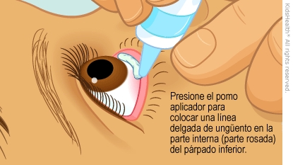 - Oprima el pomo aplicador para colocar una línea delgada de ungüento en la parte interna (parte rosada) del párpado inferior. Comience cerca de la nariz y mueva el aplicador hacia el oído. En general, es suficiente colocar ½ pulgada (1 centímetro) de ungüento.