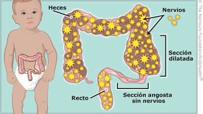 En los casos de enfermedad de Hirschsprung, las personas nacen con muy pocas o ninguna célula nerviosa en algunas partes o en la totalidad del intestino grueso (colon). Esto dificulta el movimiento de la materia fecal a través del colon y hacia fuera del ano. Se forma un tapón, de modo que el niño se constipa y no puede mover el vientre de forma normal. Si este problema no se corrige, puede derivar en complicaciones con riesgo de vida.